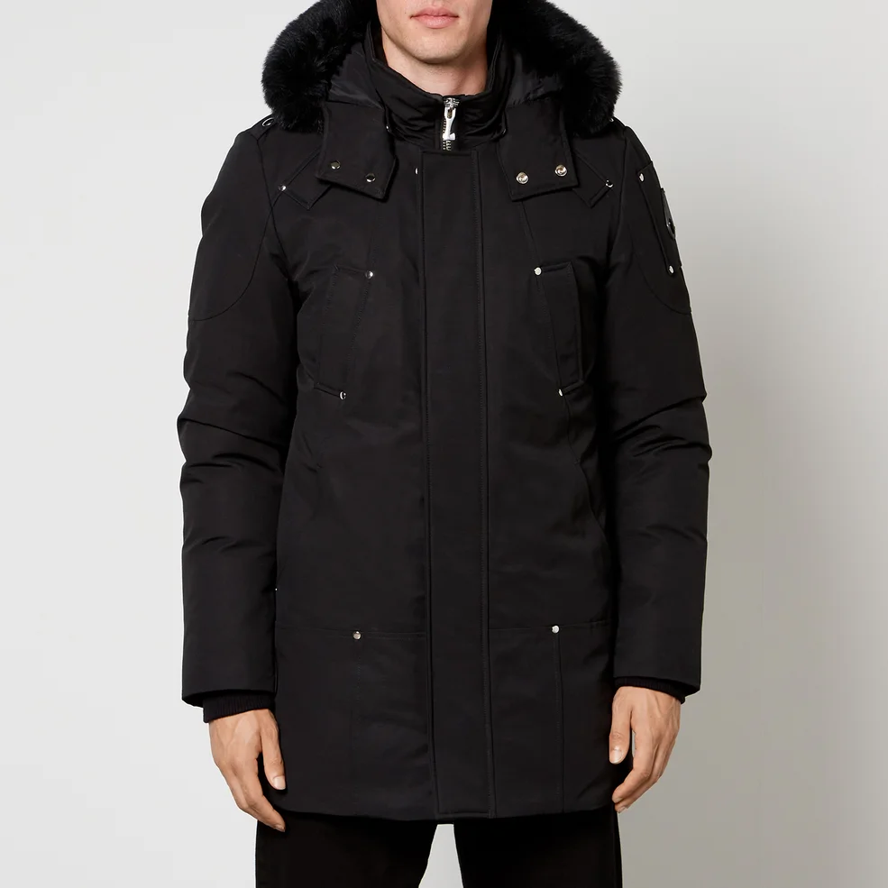 Moose Knuckles primes you for difficult climes ahead with its innovative range of outerwear. This Stirling parka has a midi silhouette made from an enduring cotton and nylon-blend. Fleecy pockets and shearling fabric along the hood help to trap additional warmth.